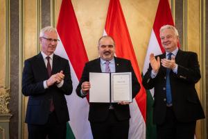 A közös fényképfelvételen vezető munkatársaink, Horváth Sándor, Dr. Szilágyi Béla, Révész Szilvia és Szabó Márk Soltész Miklóssal, a Miniszterelnökség egyházi és nemzetiségi kapcsolatokért felelős államtitkárával láthatók